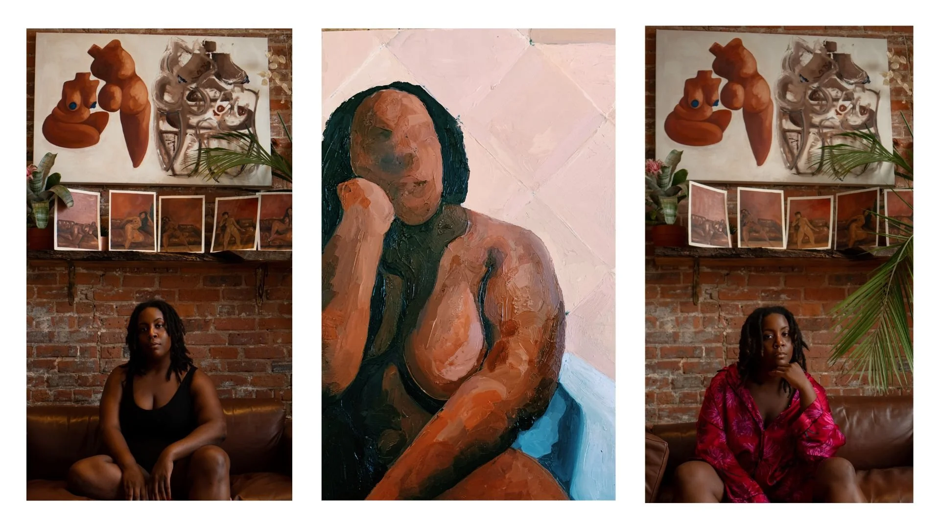 ashley’s artistic practice is an evolving tribute to Blackness, memory, and emotional expression. She challenges the misconception of Black as the absence of color by embracing vibrant palettes that reflect the warmth, complexity, and richness of Black and brown skin. Her series, Bodies in Space, began as a grounding practice during the COVID-19 pandemic and celebrates the physicality and strength of Black women, honoring body parts that are often shamed. The Couch meditates on the presence and ease of Black bodies within spaces, encouraging viewers to consider the quiet power of softness and self-assuredness. Following the loss of her father, ashley began Finding Home as an exploration of memory, security, and home, capturing self-portraits in various spaces that held meaning throughout her journey. Together, these series serve as both personal reflections and universal calls for healing, resilience, and self-acceptance.